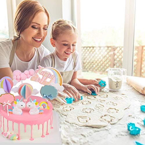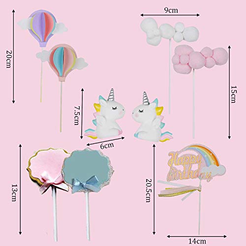 🎈 Taartdecoratieset voor eenhoornliefhebbers: 2 * zittende eenhoorn, 1 * regenboog, 2 * handgeschreven groet plugin, 2 * wolk, 2 * heteluchtballon, 1 * Happy Birthday topper met rok. Regenboog met kleurrijke verjaardagsvlag, geschikt voor regenboogthema- en verjaardagsdecoraties.